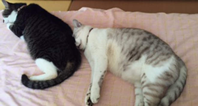 画像は、昨夜珍しく落ち込んで寝た私が朝目を覚ましたら、レオとルーが縦一列で添い寝。優しい〜